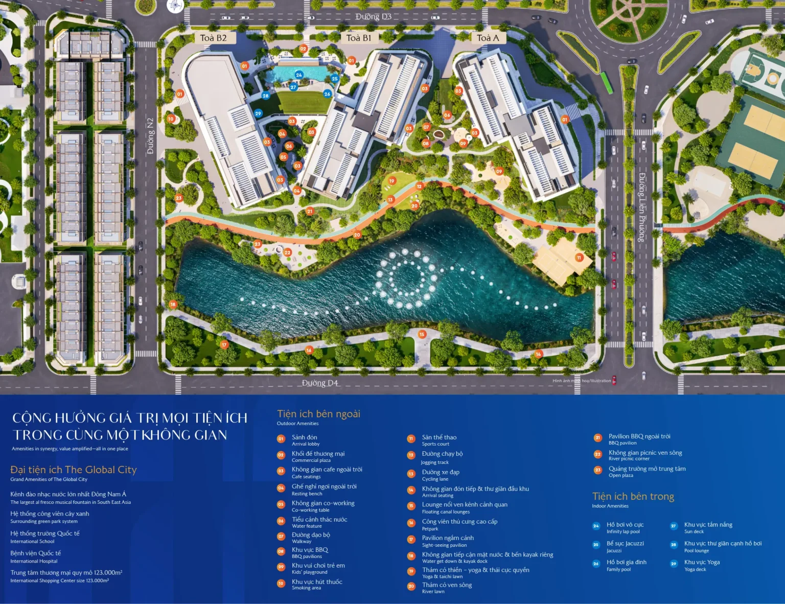 Hệ tiện ích tại Masteri Cosmo Central được quy hoạch đồng bộ trong cùng một không gian sống, nơi các hoạt động vận động, thư giãn và kết nối cộng đồng diễn ra liền mạch. Mỗi tiện ích được bố trí khoa học, tối ưu công năng sử dụng, đáp ứng trọn vẹn nhu cầu sống, làm việc và tái tạo năng lượng của cư dân đô thị hiện đại.